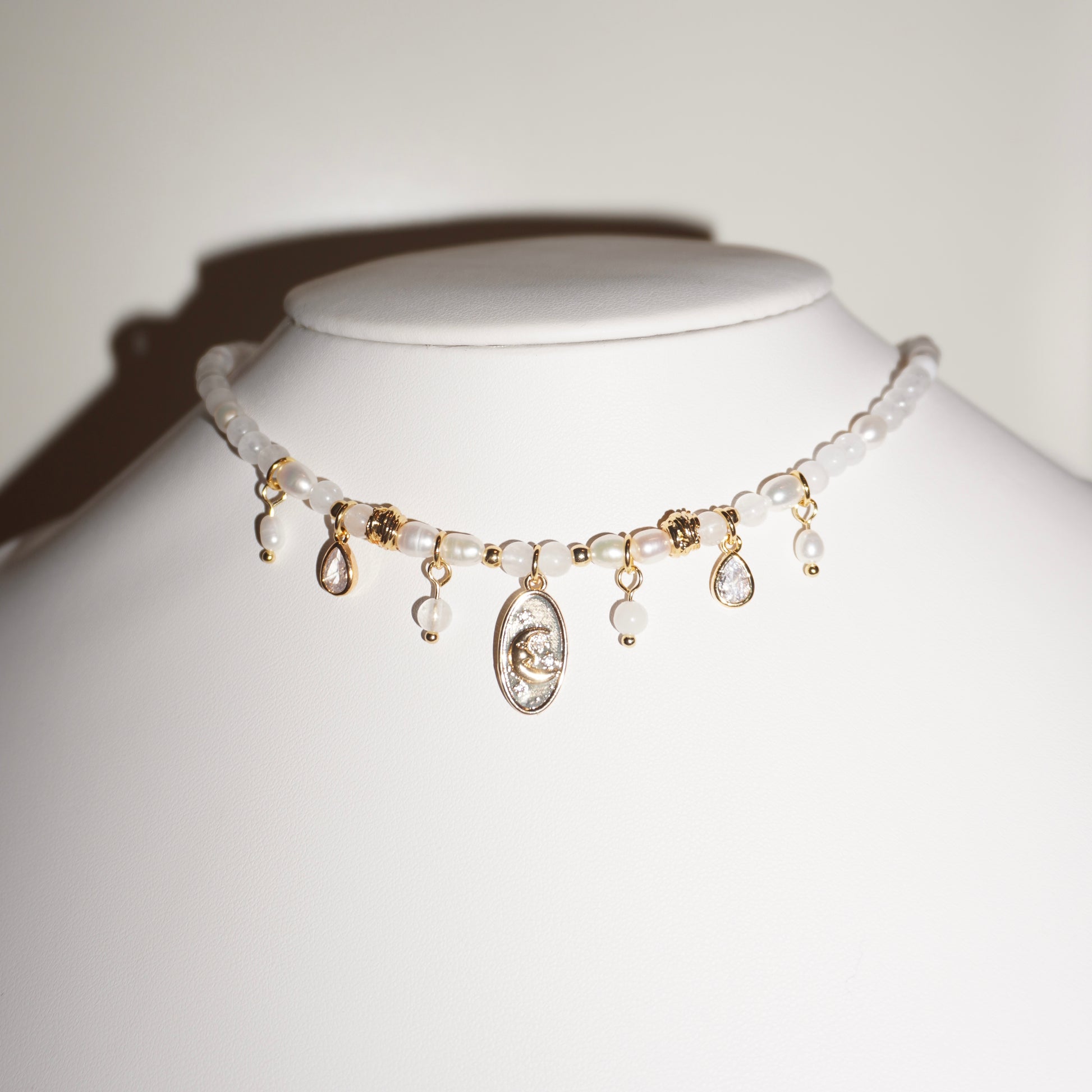 • Dieses Schmuckstück enthält natürliche Materialien wie Edelsteine und Perlen, die empfindlich auf Feuchtigkeit reagieren können.