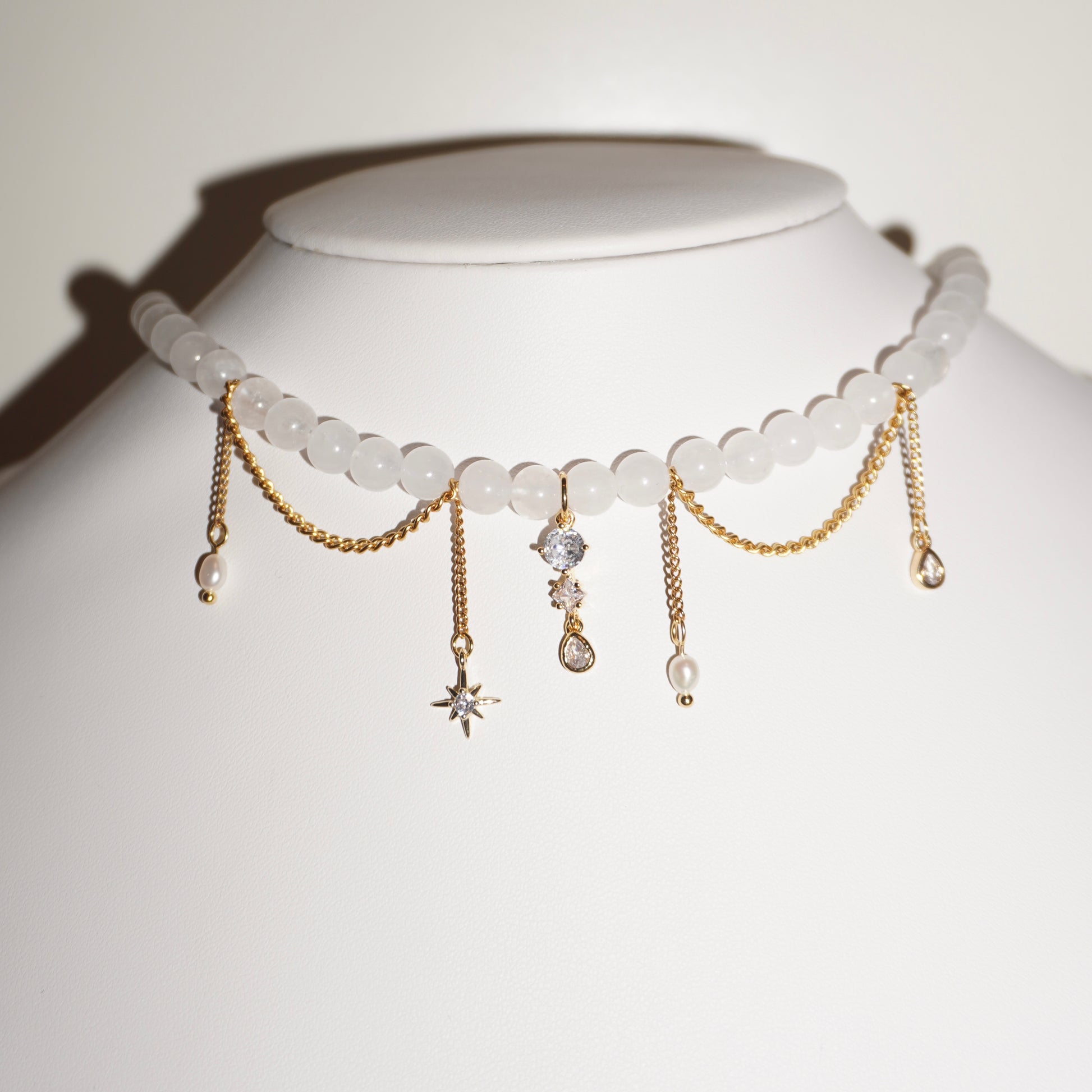 • Dieses Schmuckstück enthält natürliche Materialien wie Edelsteine und Perlen, die empfindlich auf Feuchtigkeit reagieren können.