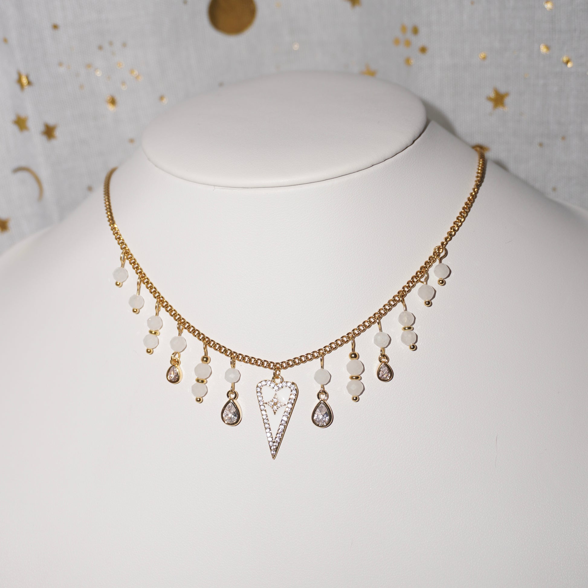 • Dieses Schmuckstück enthält natürliche Materialien wie Edelsteine und Perlen, die empfindlich auf Feuchtigkeit reagieren können.